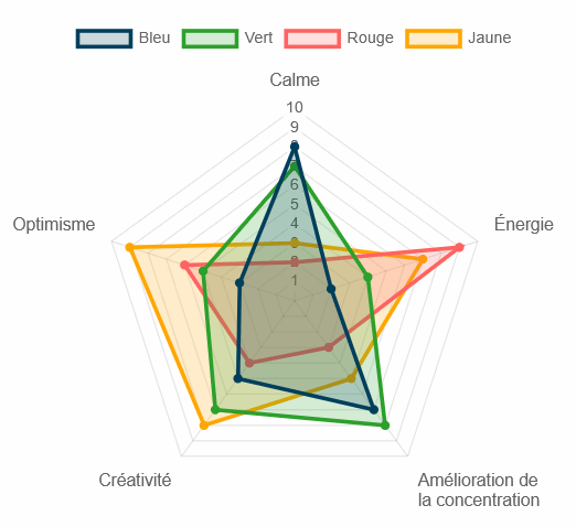 Chaque couleur active des réponses cérébrales distinctes. Ce diagramme compare les impacts relatifs de différentes teintes sur des aspects clés de notre état mental, démontrant qu’il n’y a pas de « bonne » couleur, mais une couleur adaptée à chaque fonction.