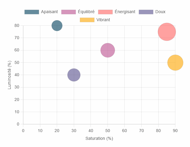L’impact d’une couleur dépend aussi de son intensité (saturation) et de sa clarté (luminosité). Des couleurs vives et saturées stimulent, tandis que des teintes douces et désaturées apaisent. Cet équilibre est la clé d’un design réussi.